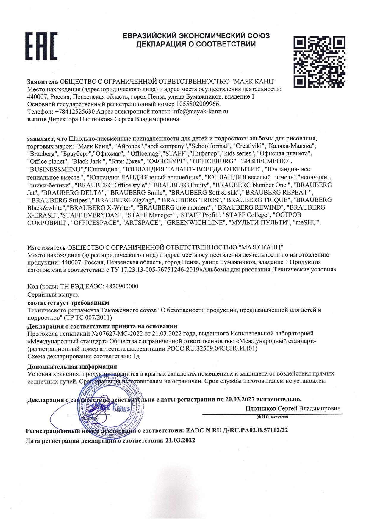 Содержит 12 листов плотностью 100 г/м2 формата А4 (203х288 мм). Красочная обложка выполнена из офсетной бумаги. Скрепление листов осуществляется с помощью скрепки. Подходит для смешанных техник рисования: красками, карандашами и фломастерами.