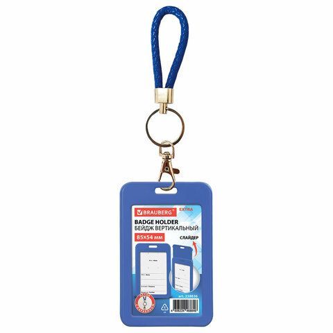 Бейдж вертикальный (85х54 мм), петля с карабином, СЛАЙДЕР, синий, BRAUBERG 10 шт. EXTRA, 238836
