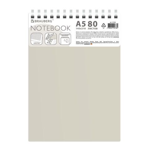 Блокнот А5 80л, BRAUBERG, силиконовый гребень, обложка пластик, клетка, бежевый, 117559