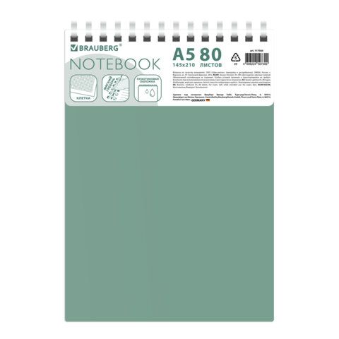 Блокнот А5 80л, BRAUBERG, силиконовый гребень, обложка пластик, клетка, зеленый, 117560