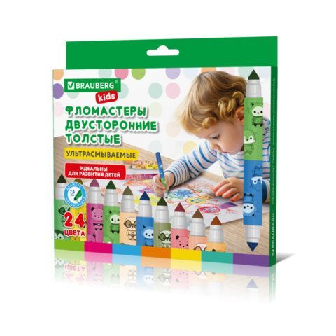 Фломастеры двусторонние толстые для малышей ультрасмываемые 12 штук/24 цвета, BRAUBERG KIDS, 152626
