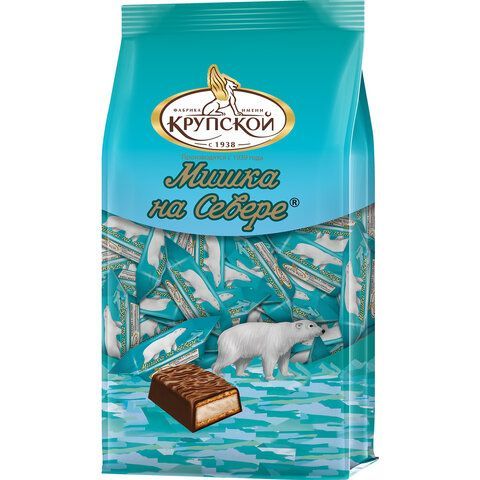 Конфеты глазированные ФАБРИКА ИМ. КРУПСКОЙ "Мишка на севере" - в шоколадной глазури, под которой можно найти тонкие слои вафли и нежную начинку с ореховым вкусом. Начинка - растертые с сахаром ядра миндаля и кешью.