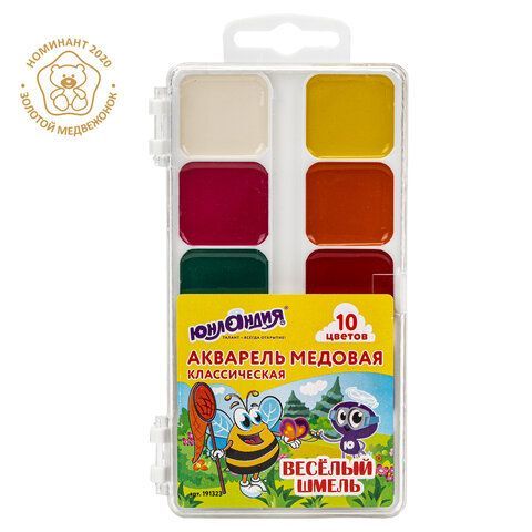 - Краски акварельные ЮНЛАНДИЯ 12 шт. "ВЕСЁЛЫЙ ШМЕЛЬ", медовые, 10 цветов, КЛАССИЧЕСКИЕ, пластик, 191323