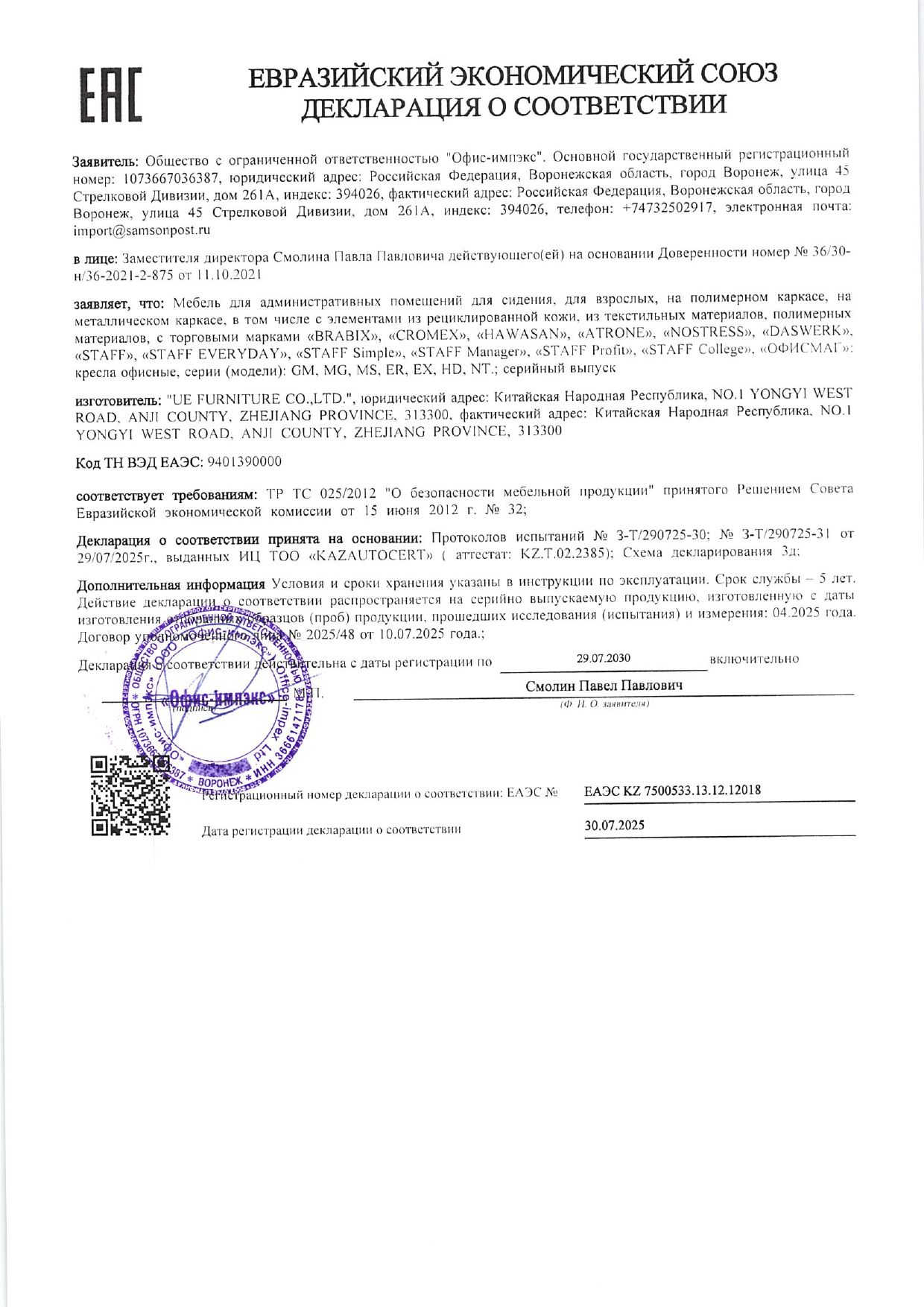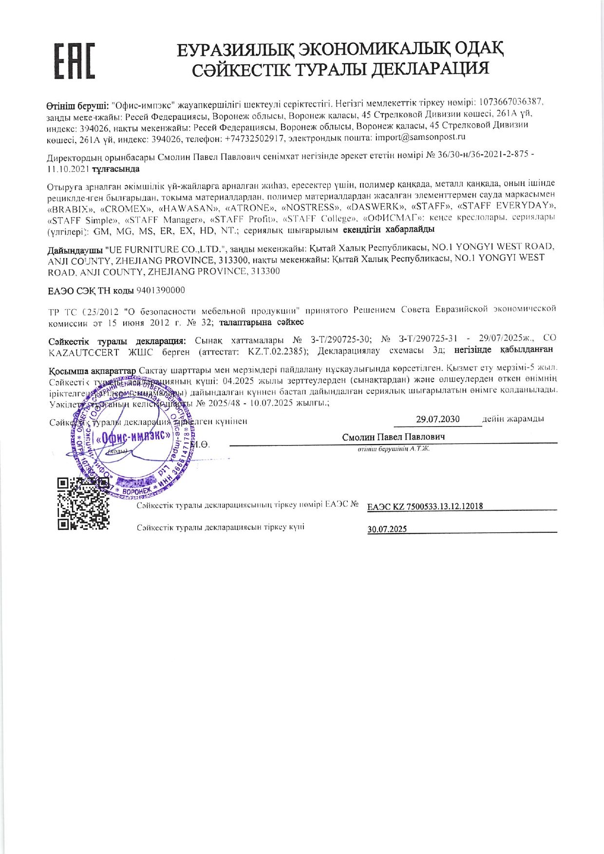 | Тип механизма кресла | "Топ-ган" - качание с регулировкой под вес и фиксацией в 1 положении |