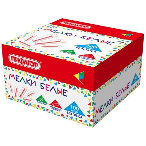 - Мел белый БЕЗ ПРИМЕСЕЙ квадратный 100 штук, мягкое письмо, ПИФАГОР, картонная упаковка, 274123