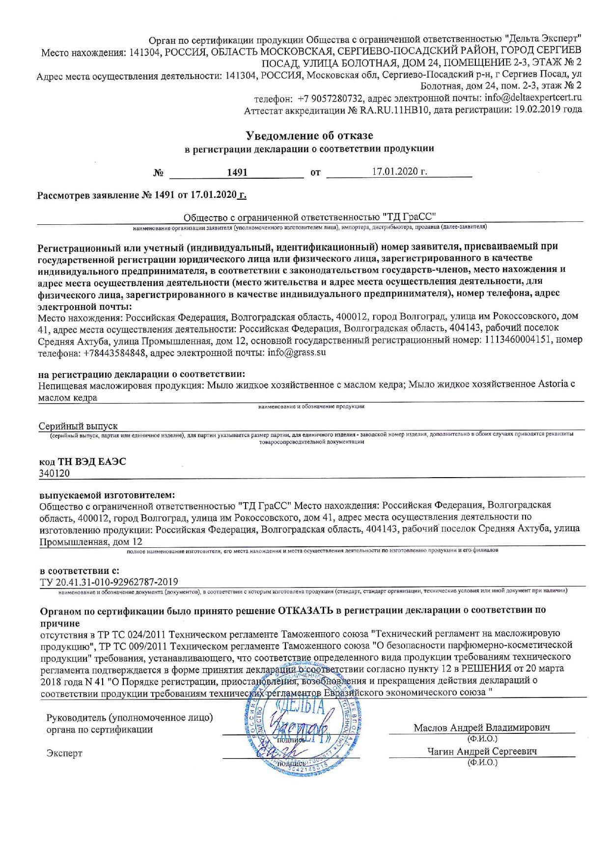 Соответствует требованиям ГОСТа | ТУ 20.41.44-041-00156937-2020 |