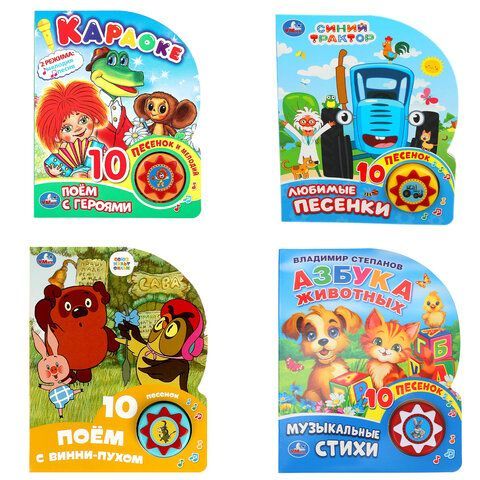 Каждая книжка "ЛЮБИМЫЕ ПЕСЕНКИ" содержит 10 музыкальных композиций, Ребенку понравятся любимые персонажи, яркие иллюстрации, фигурная вырубка и удобный формат. Развивает слуховое восприятие, мелкую моторику, фантазию, образное мышление, память.