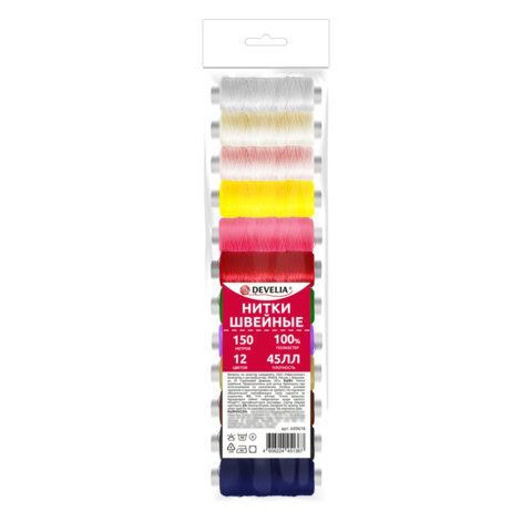 Нитки швейные 45ЛЛ 150 м, полиэстер, НАБОР 12 цветов, DEVELIA (Девелиа), 609618