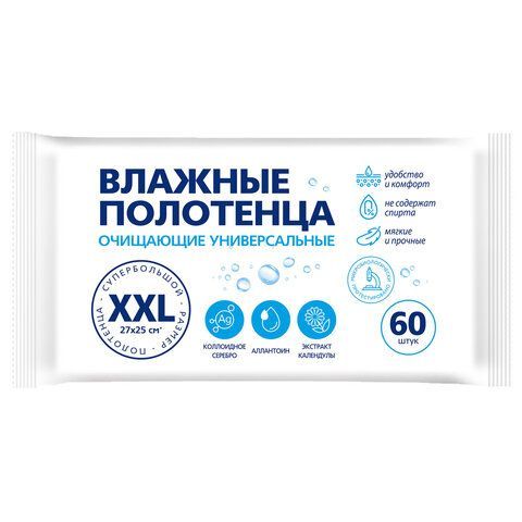 Полотенца влажные XXL 60 шт, 25х27см, АВАНГАРД, с аллантоином и коллоидным серебром,, 80979