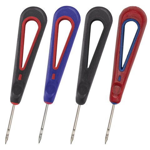 Оснащено иглой с ушком диаметром 3 мм и длиной 4 см из металла с пластиковой цветной рукояткой. Шило обеспечивает прокалывание до 30 листов бумаги. Поставляется в блистере с подвесом. Большое канцелярское шило STAFF - необходимый офисный атрибут.