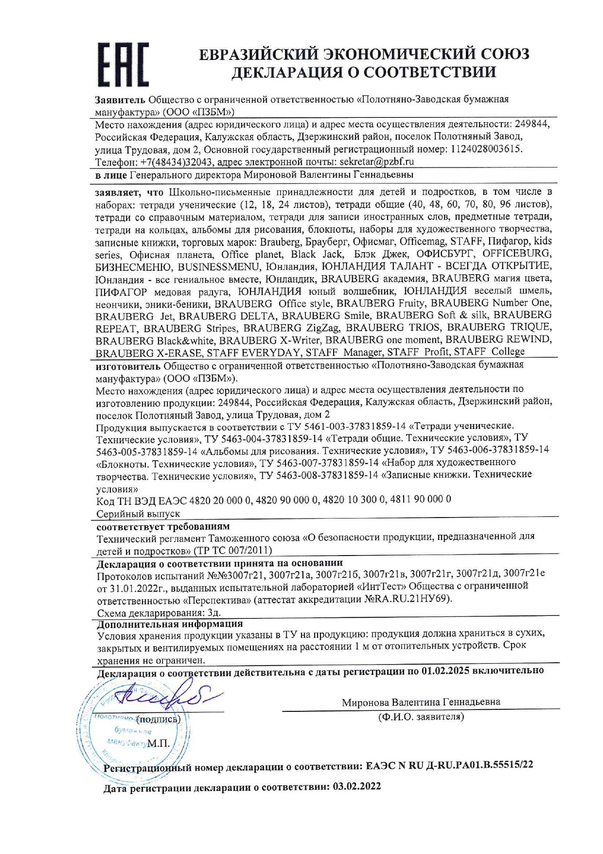 Внутренний блок содержит 96 листов офсетной бумаги плотностью 60 г/м2. Обложка изготовлена из мелованного картона и покрыта глянцевым лаком. Линовка – клетка. Гребень надежно скрепляет листы между собой. Белизна – 100%. Формат А5.