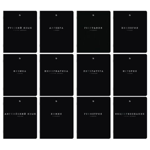В комплекте 12 тетрадей: Алгебра, Английский язык, Биология, География, Геометрия, Обществознание, История, Информатика, Литература (в линию), Русский язык (в линию), Физика, Химия.